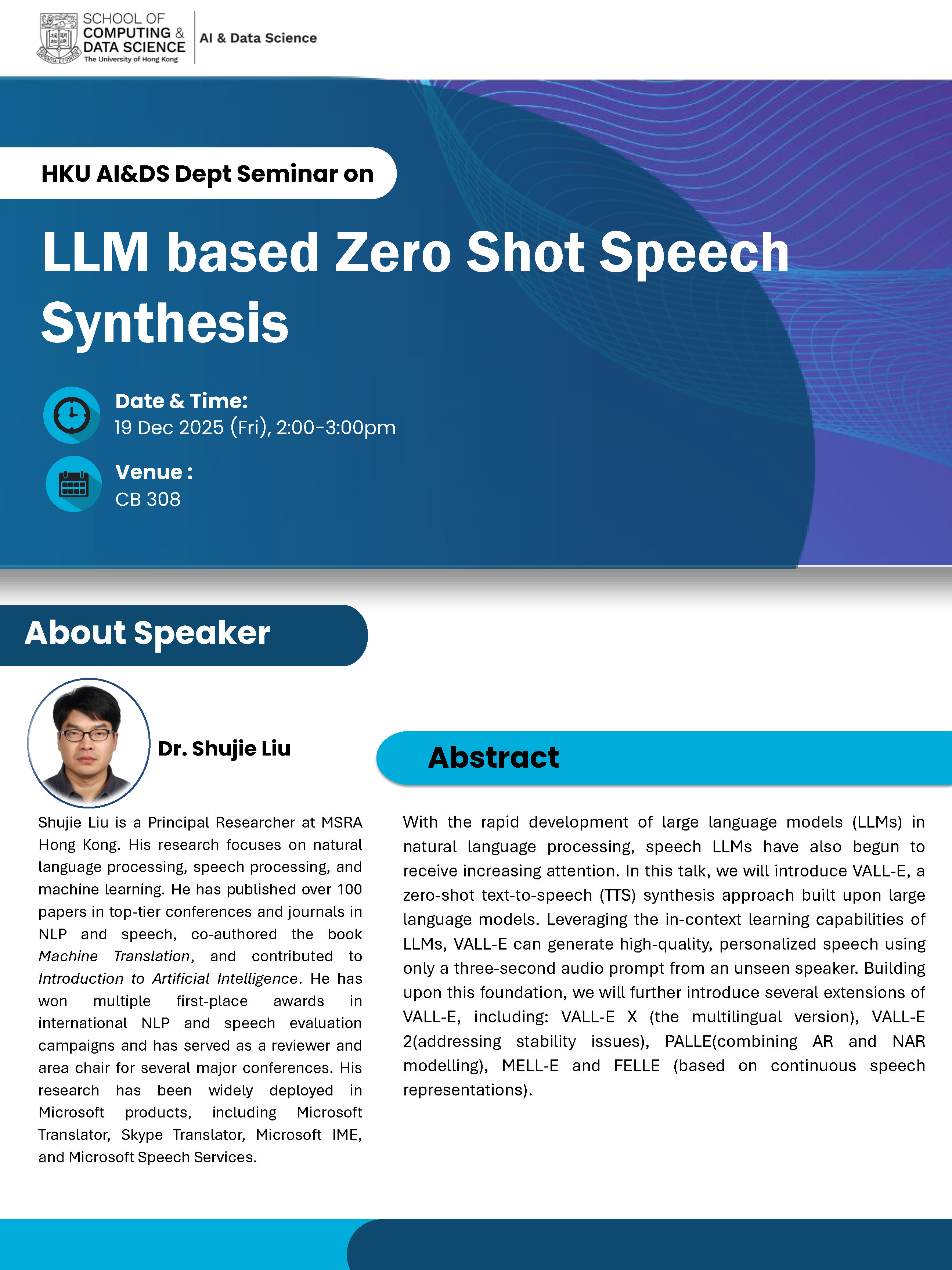 With the rapid development of large language models (LLMs) in natural language processing, speech LLMs have also begun to receive increasing attention. In this talk, we will introduce VALL‑E, a zero‑shot text‑to‑speech (TTS) synthesis approach built upon large language models. Leveraging the in‑context learning capabilities of LLMs, VALL‑E can generate high‑quality, personalized speech using only a three‑second audio prompt from an unseen speaker. Building upon this foundation, we will further introduce several extensions of VALL‑E, including: VALL‑E X (the multilingual version), VALL‑E 2(addressing stability issues), PALLE(combining AR and NAR modelling), MELL‑E and FELLE (based on continuous speech representations).