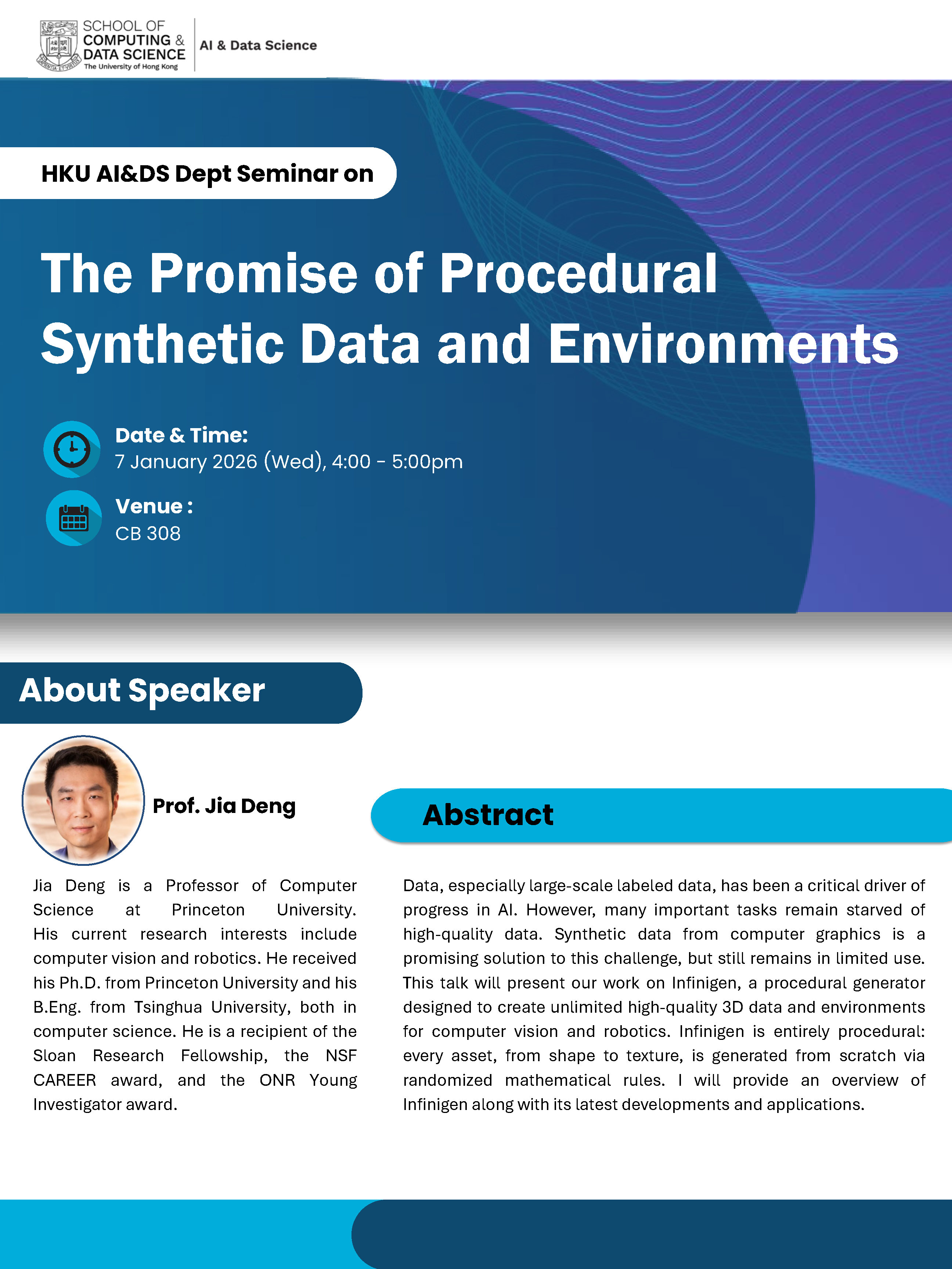Data, especially large-scale labeled data, has been a critical driver of progress in AI. However, many important tasks remain starved of high-quality data. Synthetic data from computer graphics is a promising solution to this challenge, but still remains in limited use. This talk will present our work on Infinigen, a procedural generator designed to create unlimited high-quality 3D data and environments for computer vision and robotics. Infinigen is entirely procedural: every asset, from shape to texture, is generated from scratch via randomized mathematical rules. I will provide an overview of Infinigen along with its latest developments and applications.