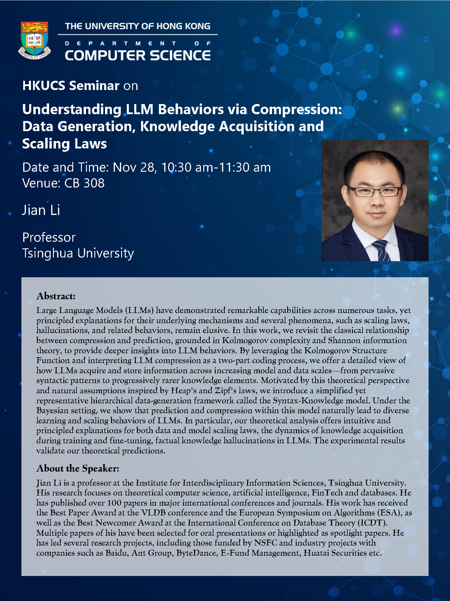 | Understanding LLM Behaviors via Compression: Data Generation, Knowledge Acquisition and Scaling Laws | Prof. Jian Li | November 28, 2025 10:30 am - 11:30 am |