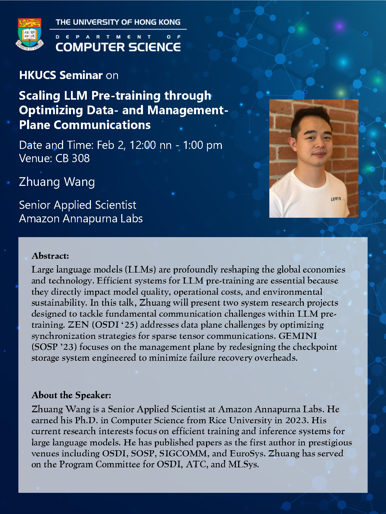 | Scaling LLM Pre-training through Optimizing Data- and Management-Plane Communications | Dr. Zhuang Wang | February 2, 2026 12:00 nn - 1:00 pm |
