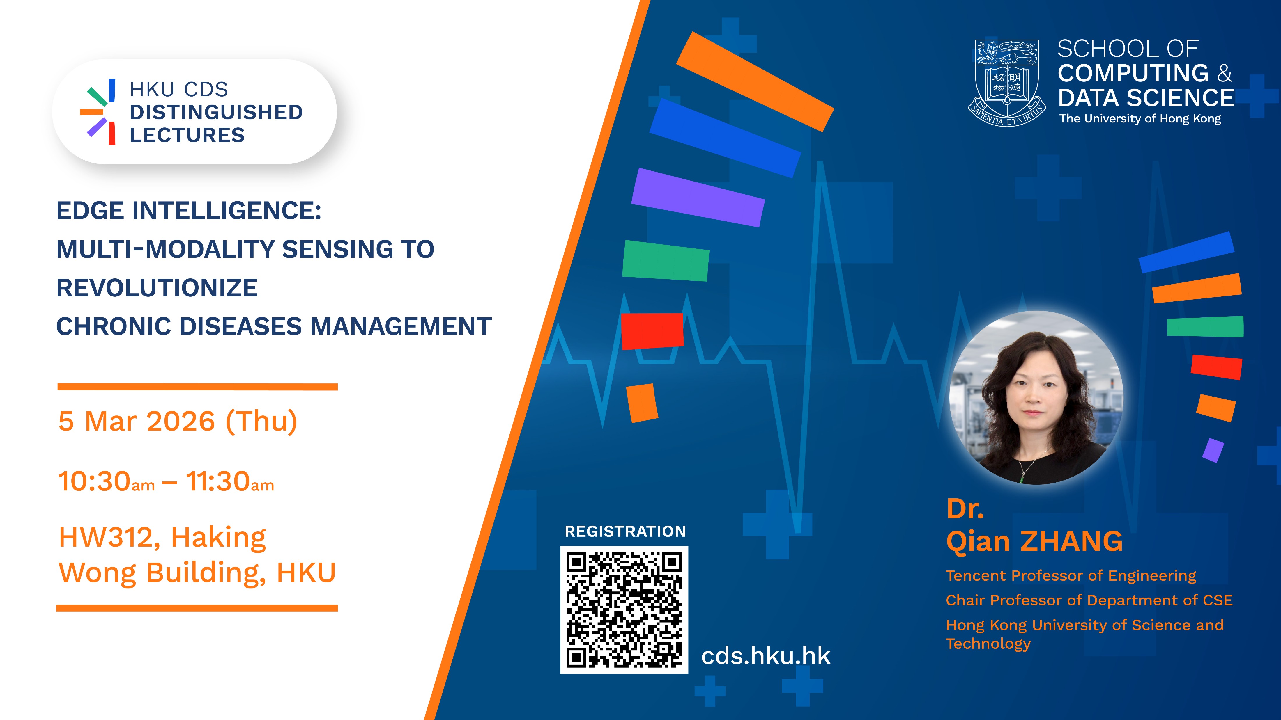 Dr. Qian Zhang will share their recent work on chronic disease assessment and intervention supported by intelligent sensing (multiple sensing modality will be leveraged) and AI algorithm design. She will use cuffless continuous blood pressure monitoring (leveraging mmWave and fiber optics), as well as COPD assessment and training (leveraging audio, IMU, as well as depth camera), as example for the sharing.