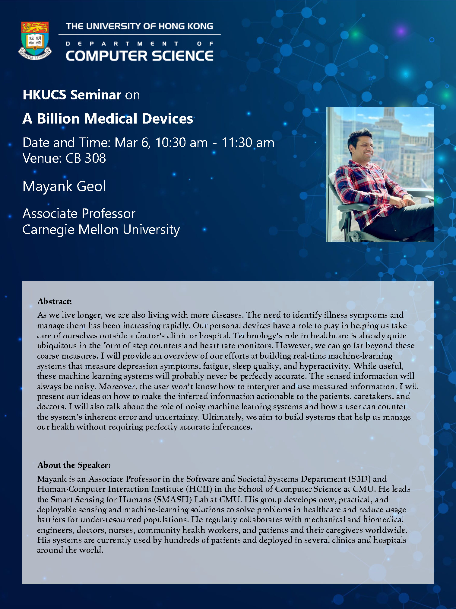 Mayank is an Associate Professor in the Software and Societal Systems Department (S3D) and Human-Computer Interaction Institute (HCII) in the School of Computer Science at CMU. He leads the Smart Sensing for Humans (SMASH) Lab at CMU. His group develops new, practical, and deployable sensing and machine-learning solutions to solve problems in healthcare and reduce usage barriers for under-resourced populations. He regularly collaborates with mechanical and biomedical engineers, doctors, nurses, community health workers, and patients and their caregivers worldwide. His systems are currently used by hundreds of patients and deployed in several clinics and hospitals around the world.