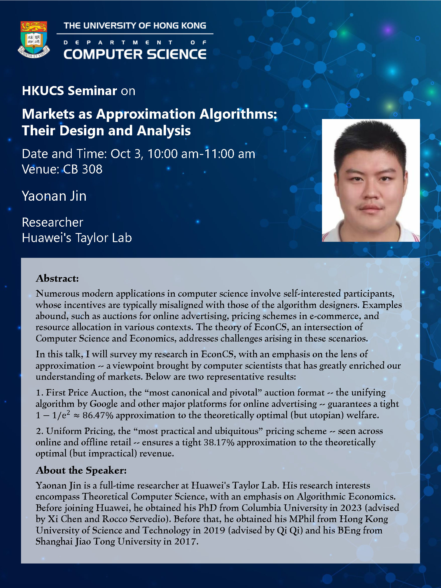 Yaonan Jin is a full-time researcher at Huawei's Taylor Lab. His research interests encompass Theoretical Computer Science, with an emphasis on Algorithmic Economics. Before joining Huawei, he obtained his PhD from Columbia University in 2023 (advised by Xi Chen and Rocco Servedio). Before that, he obtained his MPhil from Hong Kong University of Science and Technology in 2019 (advised by Qi Qi) and his BEng from Shanghai Jiao Tong University in 2017.