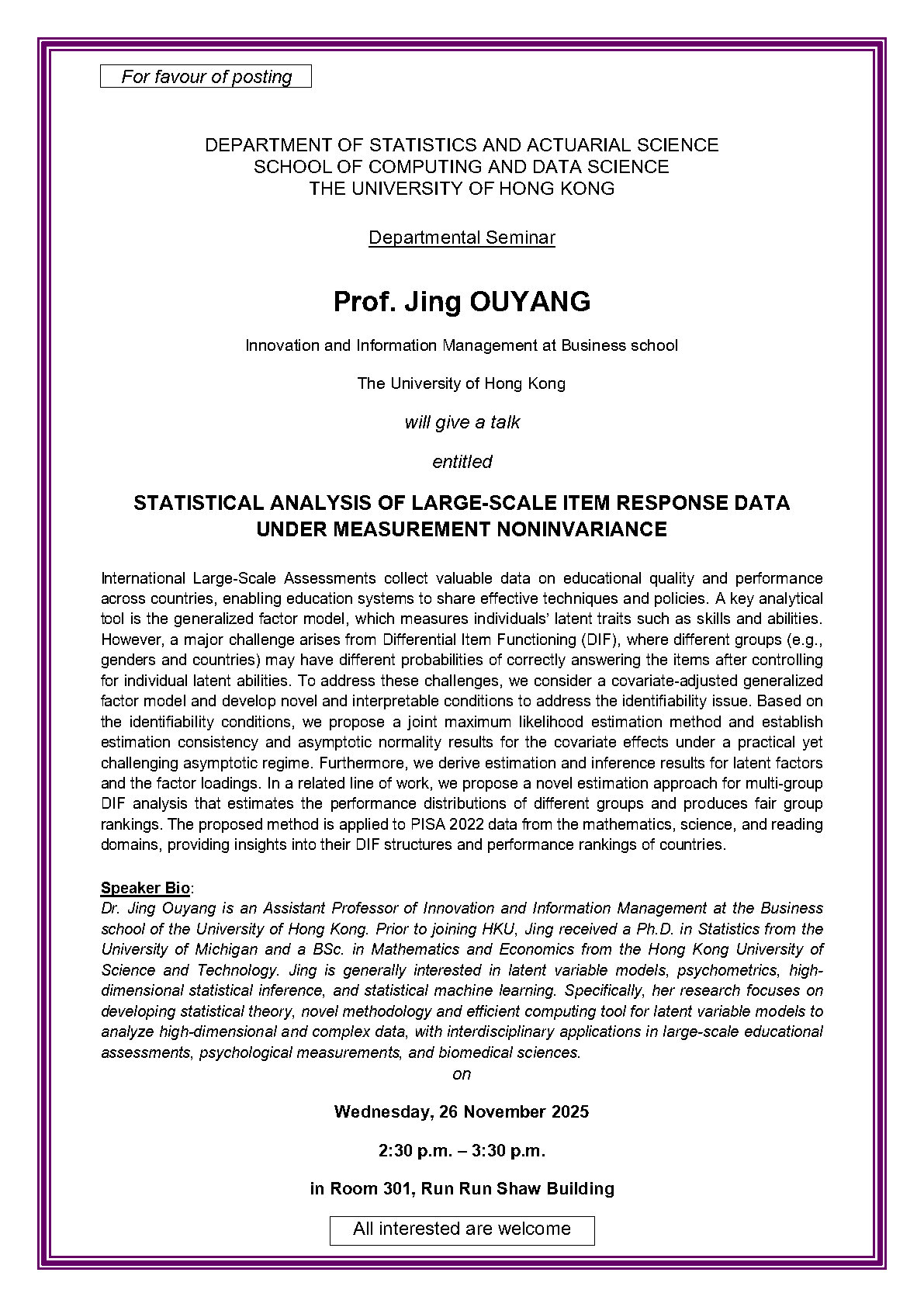 | Statistical Analysis of Large-Scare Item Response Data Under Measurement Noninvariance | Prof. Jing Ouyang | November 26, 2025 2:30 pm - 3:30 pm |